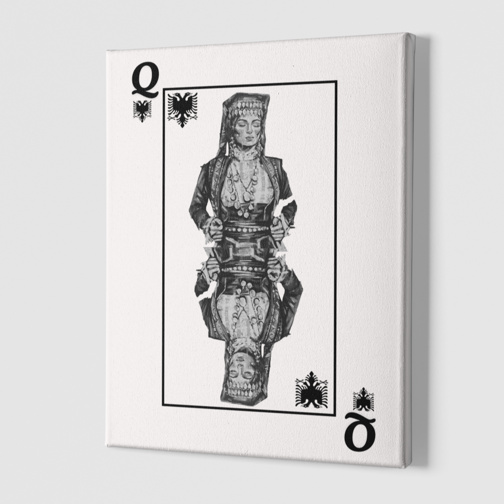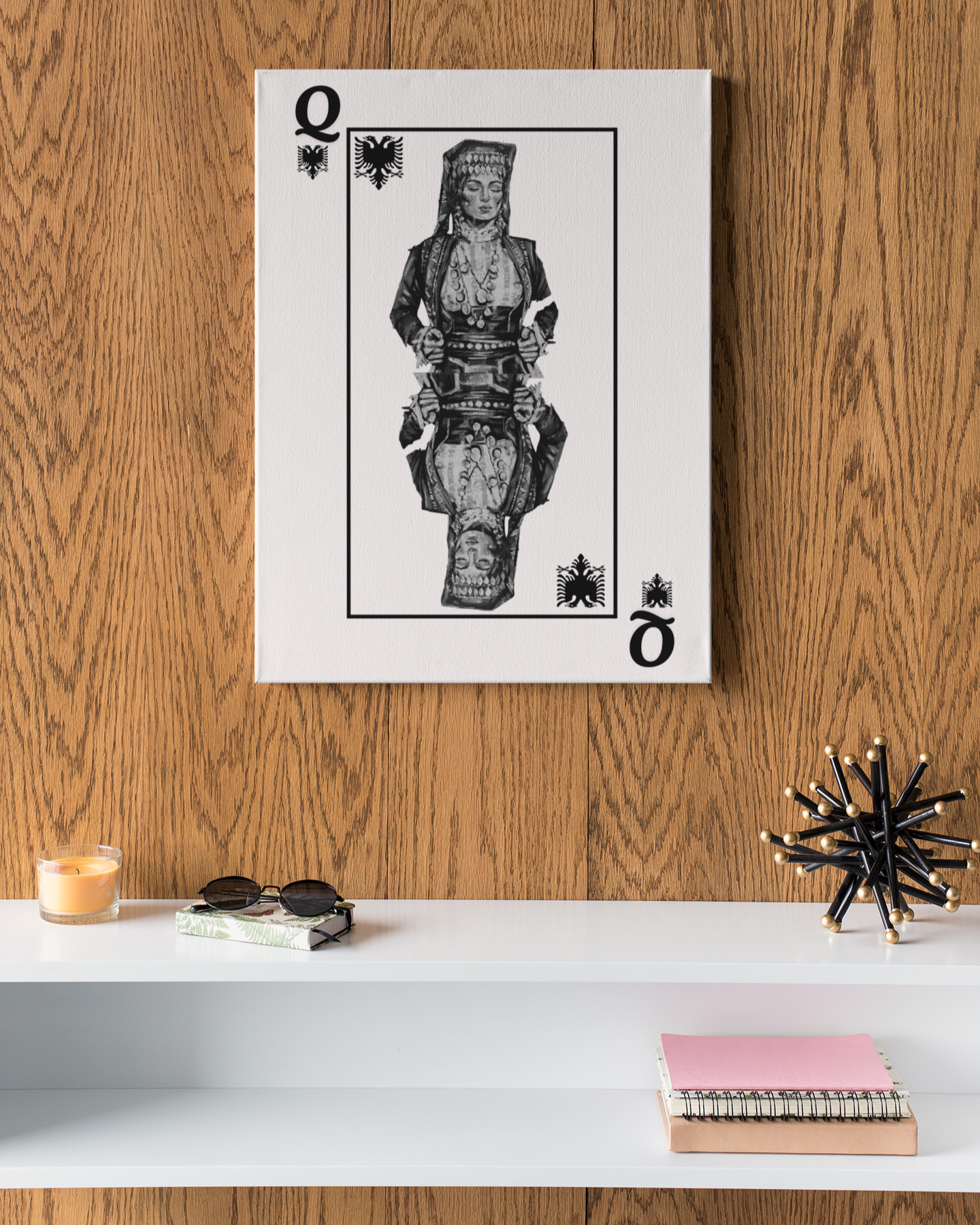 Hochwertiger, auf Holzrahmen gespannter Leinwanddruck, der die Spielkarte "Königin" mit albanischem Flair neu interpretiert. Die Karte zeigt eine stolze albanische Frau in traditioneller Tracht, kombiniert mit dem ikonischen Doppelkopfadler als Symbol der Kultur und Identität. Ein einzigartiges Kunstwerk, das Tradition und Eleganz vereint – perfekt für ein stilvolles und kulturell inspiriertes Ambiente.