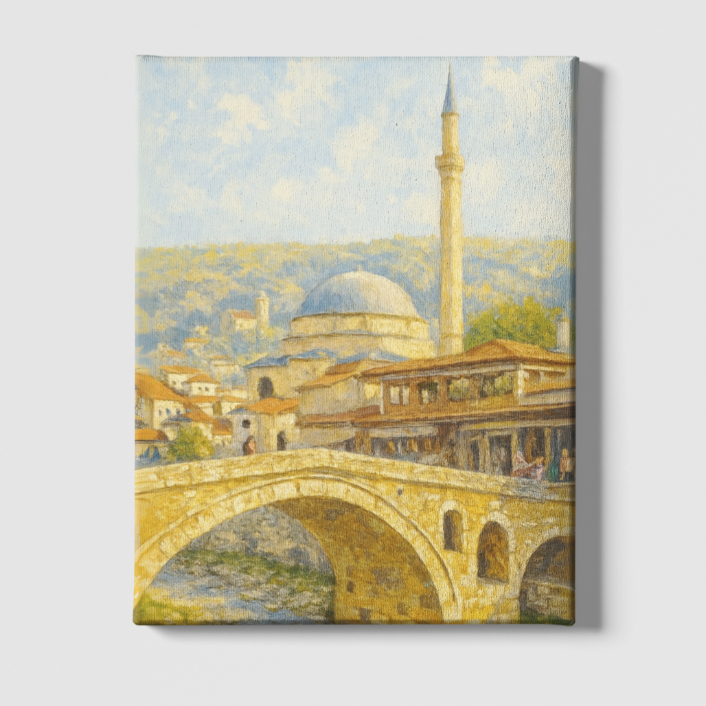 Hochwertiger, auf Holzrahmen gespannter Leinwanddruck, der die malerische Altstadt von Prizren mit ihrer ikonischen Steinbrücke und Moschee in sanften Goldtönen zeigt – ein zeitloses Abbild albanischer Kultur und Architektur.