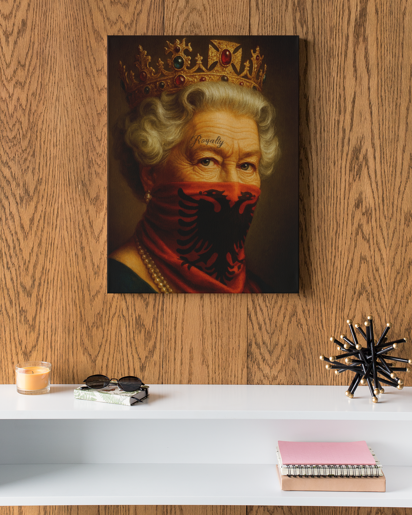 Hochwertiger, auf Holzrahmen gespannter Leinwanddruck, der die Queen mit goldener Krone und Perlenkette zeigt. Mit einer roten albanischen Maske vor dem Gesicht verbindet dieses Kunstwerk königliche Würde mit rebellischem Ausdruck.