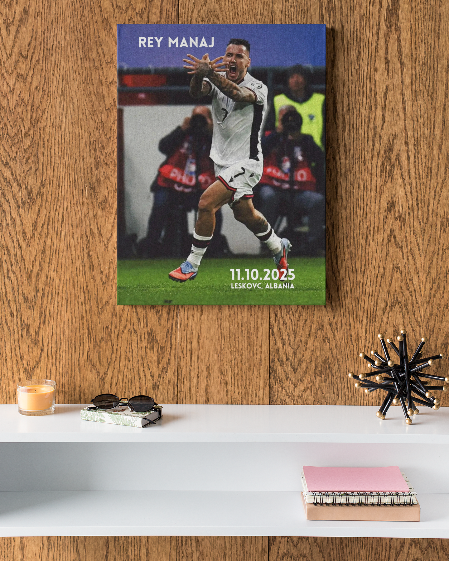 Hochwertiger, auf Holzrahmen gespannter Leinwanddruck, der Rey Manaj in einem ikonischen Moment zeigt, wie er den albanischen Adler mit seinen Händen formt.