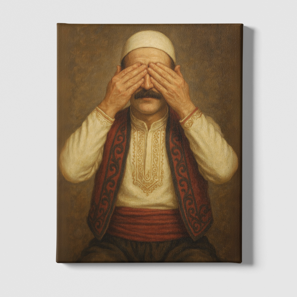 Hochwertiger, auf Holzrahmen gespannter Leinwanddruck im 3er-Set. Das Bundle zeigt in traditioneller albanischer Darstellung die drei bekannten Lebensprinzipien: Nichts gesehen, nichts gehört, nichts gesagt. Ein kunstvolles Sinnbild für Weisheit, Zurückhaltung und kulturelle Tiefe – perfekt für jede stilvolle Wand mit Botschaft.